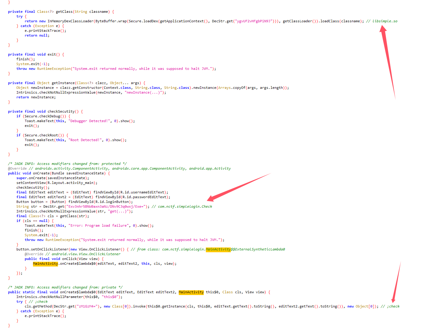 jadx加载发现代码中调用了Decstr函数来解密一些字符串,可以在libsimple.so里面找到DecStr函数实现。