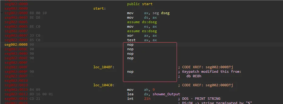 使用dosbox动调,在FA代码处是对取出的al对输入的字符串进行xor加密。0x32是取出的异或值,0x31是输入的字符’1’。