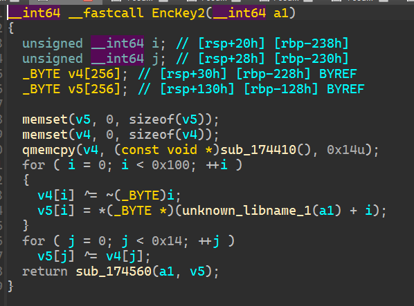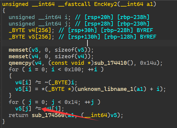 断点 EncKey2 该处,获取 0x20 长度的异或密钥数组 v4。