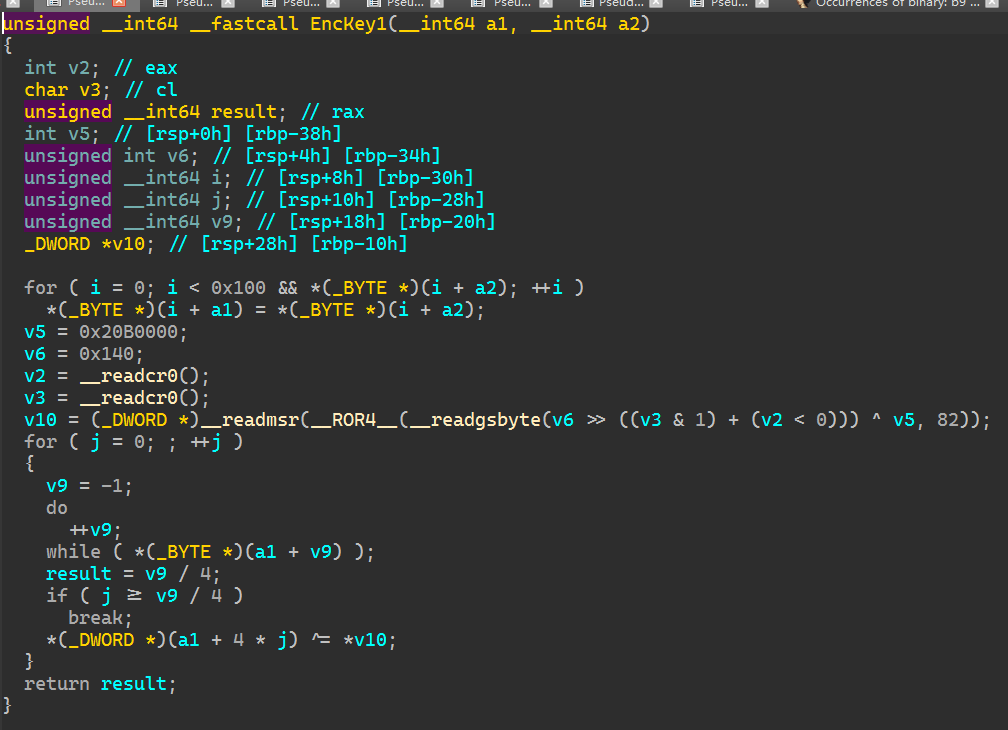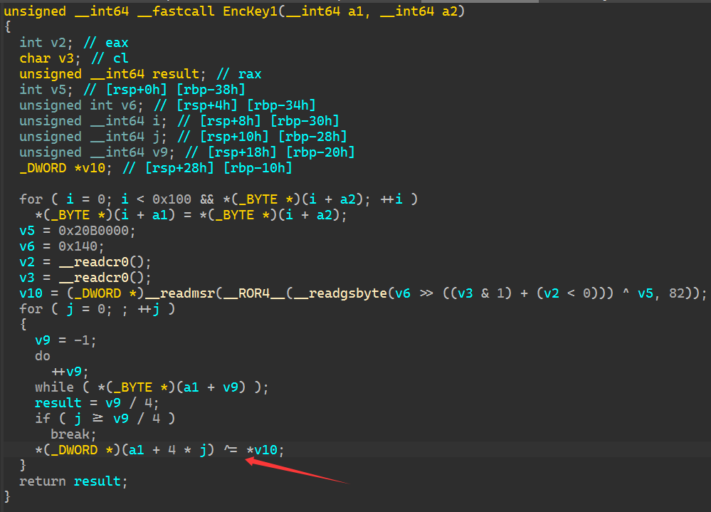 断点 EncKey1 函数该处,拿到第一个异或加密用的 Dword 密钥*v10。