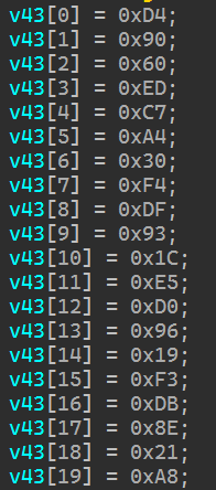 uint8_t EncKey[]{0xd4, 0x90, 0x60, 0xed, 0xc7, 0xa4, 0x30, 0xf4, 0xdf, 0x93, 0x1c, 0xe5, 0xd0, 0x96, 0x19, 0xf3, 0xdb, 0x8e, 0x21, 0xa8};