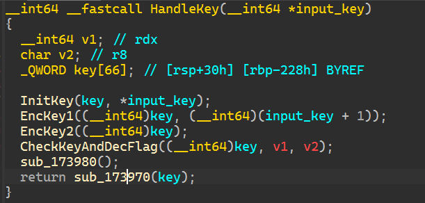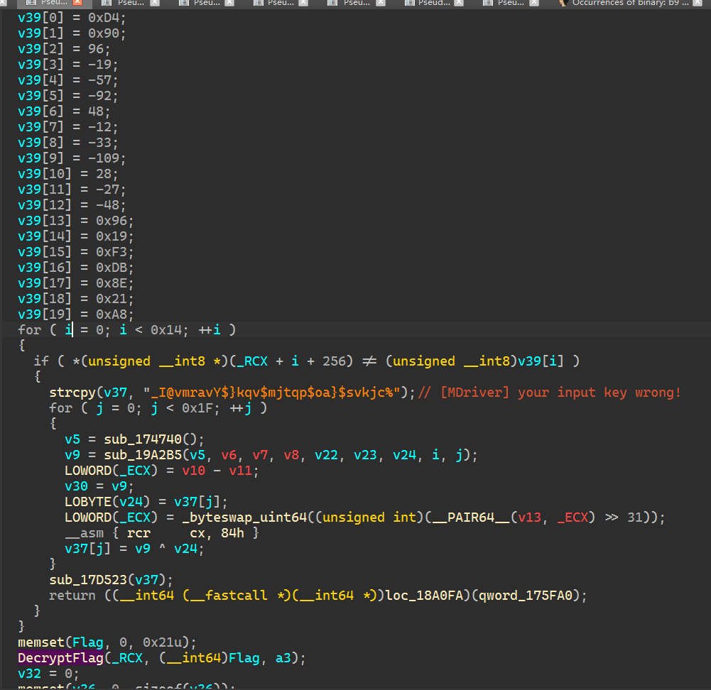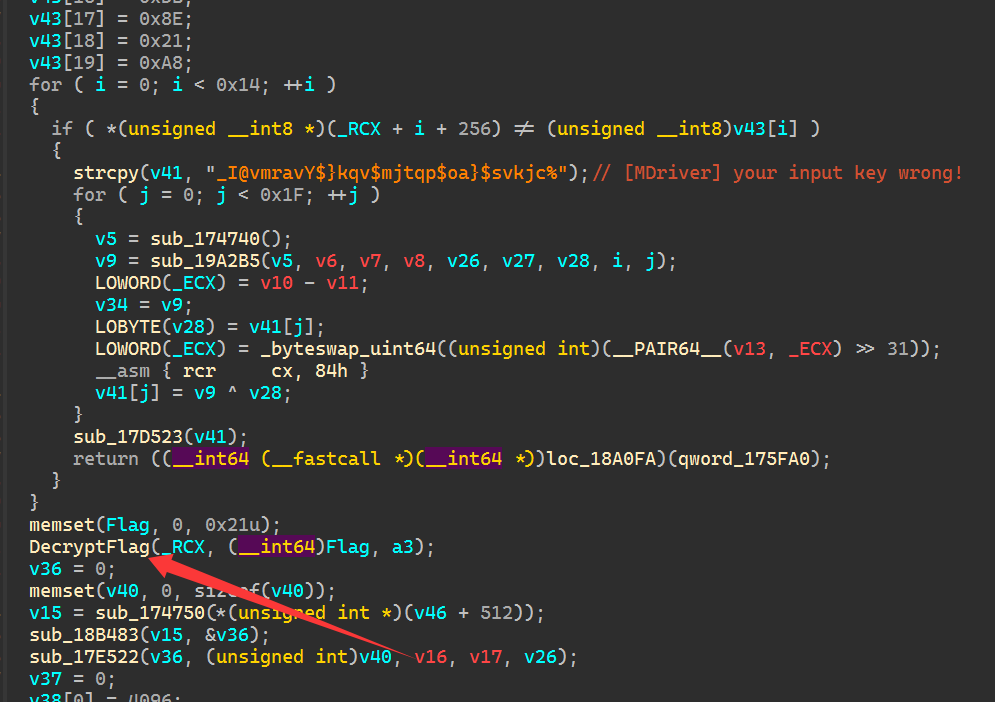 第四个函数里面有一串密文,是和我们输入的字符串加密后的密文进行比对,若比对失败则输出”[MDriver] your input key wrong!”,若成功则传入一个被 VM 虚拟化保护的函数,后续动调发现该黑盒函数就是传入 Key,然后解密返回 Flag。