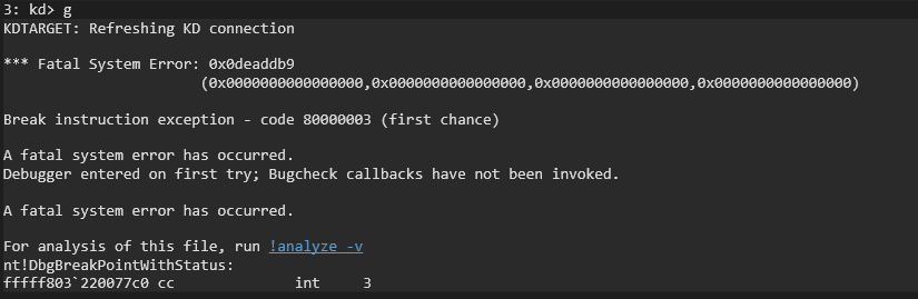 直接 g 运行后发现蓝屏,code 是 0x0deaddb9
