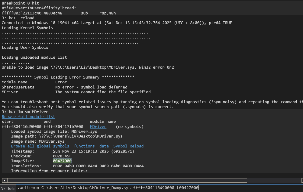.writemem C:\Users\Liv\Desktop\MDriver_Dump.sys fffff80416d90000 L00427000