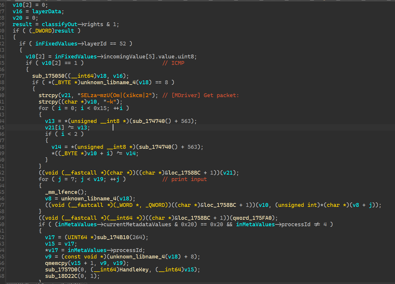 说明该 WFP 网络驱动只拦截 ICMP 网络协议数据,并会打印接收到的数据,后续将拦截的字符串数据传入 HandleKey 函数,进行后续的加密操作。