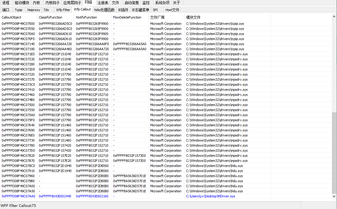 使用 YDArk 分析,发现该驱动注册了一个 Wfp 回调。